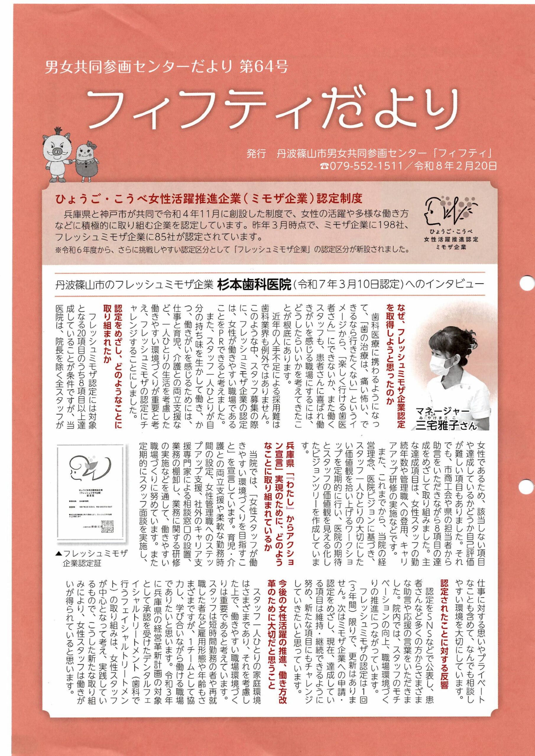 丹波篠山市男女共同参画センター「フィフティ」より、丹波篠山市のフレッシュミモザ企業(令和7年3月10日認定)として、当医院に取材に来て頂きました。